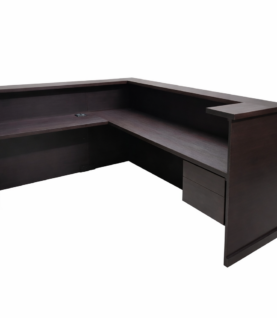 L-shaped reception counter in 1.5m, 1.8m, 2.1m, 2.4m, or 2.7m widths. Features storage, fitted power unit, and customizable finishes for a stylish, efficient office.