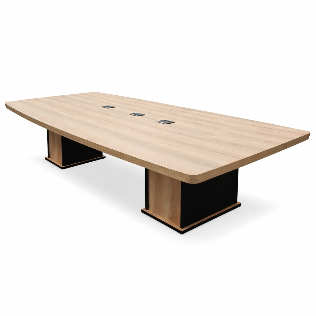 Barrel-shaped boardroom table in 10-seater (1.6m x 2.7m), 12-seater (1.8m x 2.7m), or 14-seater (1.8m x 3.0m). Features cable management, optional power docks, and customizable finishes.