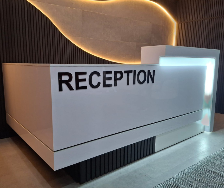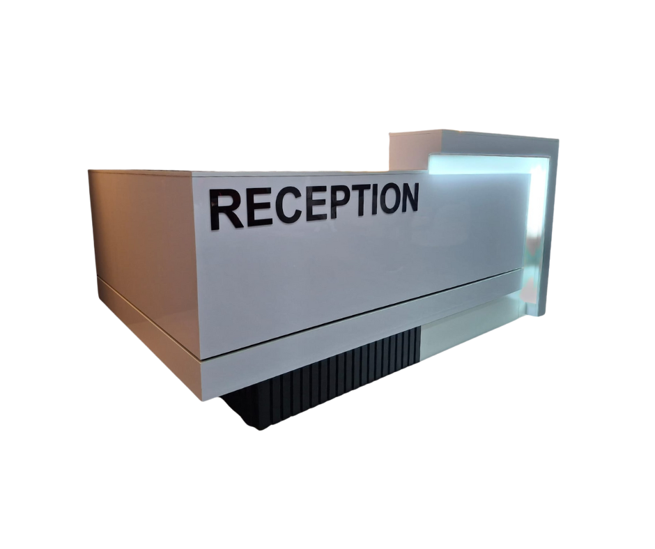 Cindy’s ABC Reception Counter features straight lines & sharp corners, showcasing our commitment to quality. The counter top, strip light & bottom black slats (creating the look of a floating counter), creates a seamless, luxurious look that enhances any workspace. Crafted with premium materials like PG Bison boards and finished with meticulous attention to detail, this counter is built to withstand high-traffic environments while maintaining its aesthetic appeal. Its 2.6m length x 1.6m on the short side of the ‘L’, provides ample space for two receptionists. This counter is ideal for busy offices seeking efficiency and style.